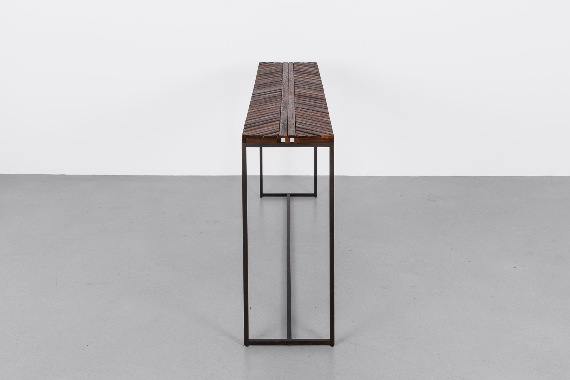 The Boardwalk Console's dynamic surface pattern emulates the original layout of the historic Coney Island Boardwalk. The table surface is created with strips of solid walnut that are hand cut and fitted to create the vivid pattern, then mounted to a simple steel frame.
